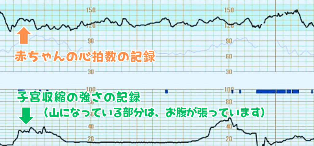 このモニターからは「赤ちゃんの心拍数は1分間に120回程度、子宮収縮は4分おき」であることが読み取れます。専門的な内容は医療者が確認しますが、様子を聞いてみるとわかりやすく教えてくれると思いますよ!