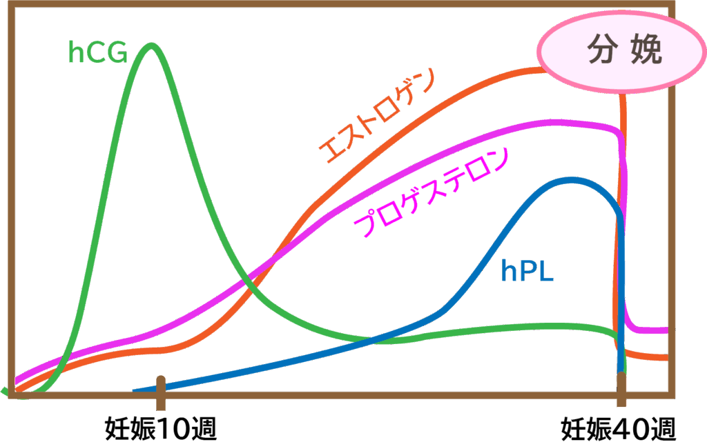 グラフがちょっと汚いですが…上の図は妊娠中に分泌されるホルモン量です。胎盤が完成すると、胎盤からホルモンが産生されるようになります。
